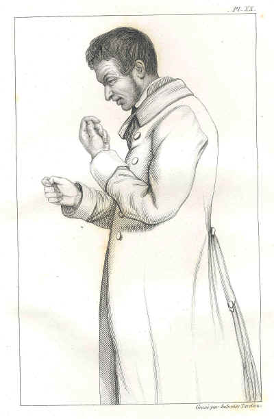 M. de G... est un autre idiot, âgé de 36 ans, entré à Charenton le 6 août 1825. Sa mère étant enceinte a éprouvé une vive affection morale. Sa taille est un peu au-dessus de la moyenne, son embonpoint est médiocre, sa tète est d'une belle conformation, ses cheveux sont châtains, ses yeux gris ; son front est large, haut et ouvert. Sa physionomie est douce, vague et cependant plus expressive que ne semble l'indiquer le peu d'étendue de son intelligence. Jusqu'à l'âge de 21 ans, M. G... chantait sans cesse, sans articuler aucun son ; il a cessé de chanter à cette époque, après un rhumatisme articulaire aigu. Néanmoins, la musique fait sur lui une très-vive impression et l'excite fortement. L'excitation est d'autant plus forte, que les instruments sont plus nombreux et plus bruyants. Ayant essayé de lui faire entendre le son d'une flûte seule, a peine a-t-il paru être sensible. Mais lorsqu'il entend une musique bruyante, il rit aux éclats, danse ou saute presque en mesure. Depuis la puberté, les femmes exercent sur lui un effet remarquable, mais moins énergique que la musique. Un jour, étant embrassé par une dame qui lui faisait des agaceries, sa joie et son excitation n'ont point augmenté, quoique sa physionomie exprimât le contentement. M. G... est onaniste. Il s'abstient pendant le jour, parce qu'il est surveillé; mais lorsqu'il est dans son lit, si on le laisse seul, il s'abandonne à ces funestes pratiques, cesse, aussitôt qu'on l'avertit ou qu'il s'aperçoit qu'on le surveille. On a observé qu'en le laissant sur son lit sans couvertures, il s'abstient : est-ce la crainte ou la honte qui le retient? Ce vice n'est pas son seul penchant. Il vole le vin des malades, et il a bien soin de se cacher d’eux et des infirmiers. La planche XX représente cet idiot dans sa pose habituelle, la régularité de ses traits est remarquable. |